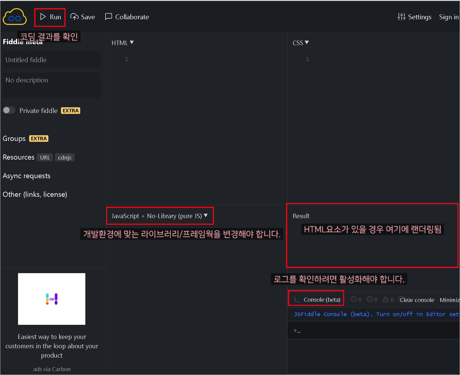 html, css, javascript영역에 해당 코드를 작성하고 좌측 상단의 Run을 실행하면 테스트가 가능하다.