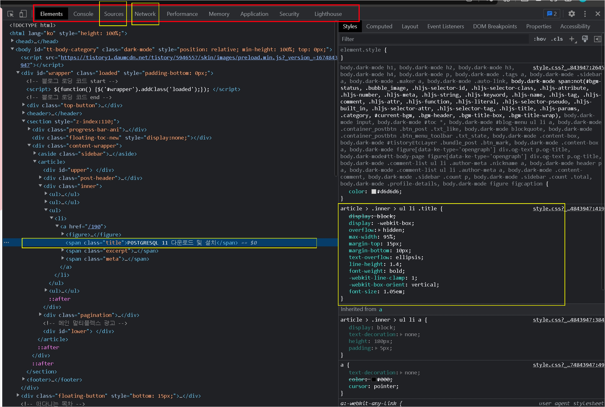 Element는 위 화면처럼 선택한 엘리먼트의 스타일이 어떻게 적용되었는지, 어떤 셀렉터(selector)로 접근해야 하는지등의 정보를 알 수 있고
