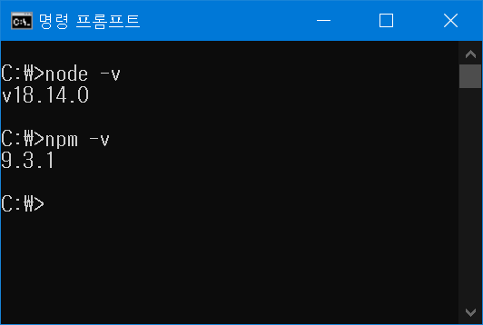 다음과 같이 node와 npm버전을 확인할 수 있다.