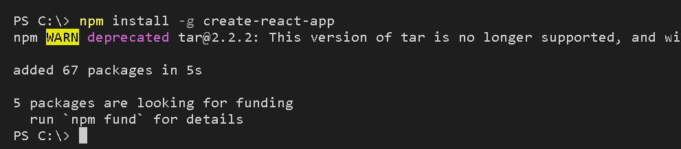 react 관련 dependency library 설치를 위해 커맨드창이나 vs코드 터미널창을 열어서 다음과 같이 명령어 엔터